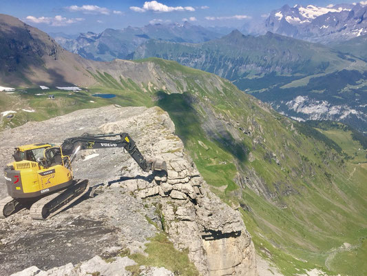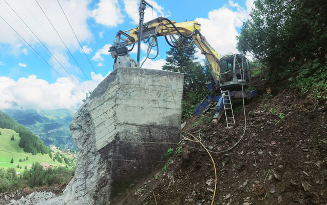 Um Felsmassiv oder grosses Gestein zu entfernen, setzen wir nebst Sprengungen auch Hammer oder bei Bedarf auch geräusch- und fibrationsarme Felsfräsen ein. Dazu gehört auch das Erstellen von